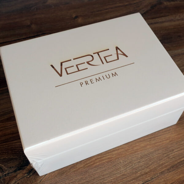 Ekskluzywna Kolekcja Herbat Veertea Premium – 96 saszetek pełnych smaku i aromatu zamkniętych w białej drewnianej skrzynce.