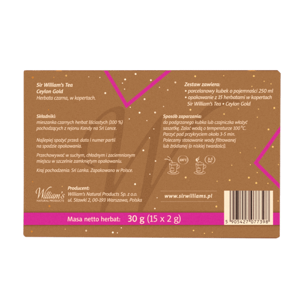 - opakowanie z 15 herbatami czarnymi Sir William’s Tea Ceylon Gold w kopertach.