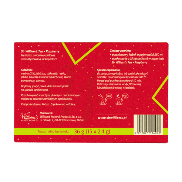- opakowanie z 15 herbatami owocowymi Sir William’s Tea Raspberry w kopertach.